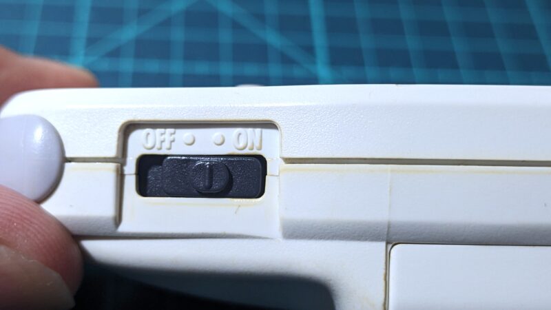以前、ゲームボーイアドバンスSPでも似たような症状となった経験から、おそらく原因は電源スイッチ部品の接触不良ではないかと思われる。