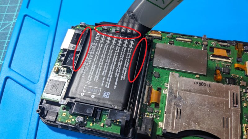 バッテリーは黒いプラスチックの枠内に収まっているため、バッテリーとプラスチック枠の隙間にヘラを差し込み、テコの原理で持ち上げる。