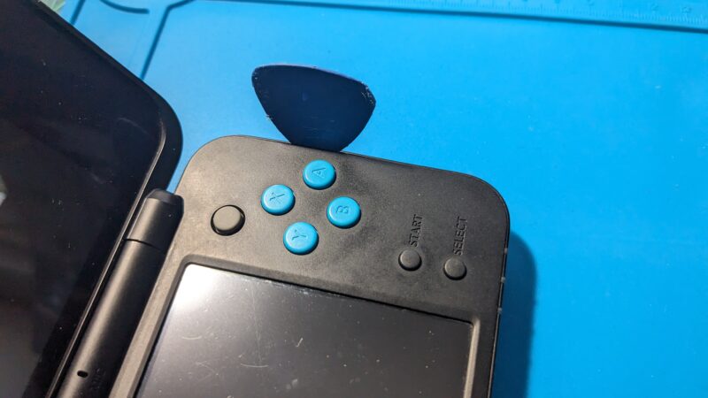 ABXY側→十字キー側のツメが外れたら、最後にヘッドホンジャック側にヘラを入れて爪を外す。