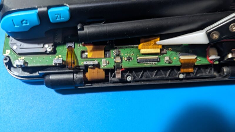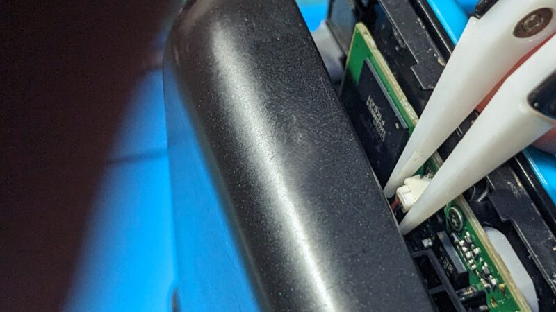 スピーカーケーブルは根元の白いプラスチックパーツをピンセット先端で摘まんで引き抜くと外れるが、部品が細かいためなかなか厄介だ。