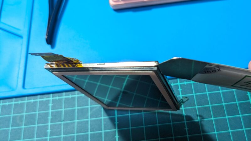 剥がした時と同じ位置に取り付けるだけの作業だが、位置がズレた状態で貼り付けるとフレキケーブルの位置がずれたりフレームの取付で噛み合わなくなるため、ここは慎重に。