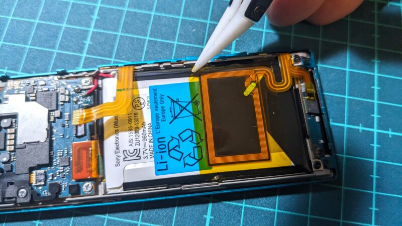 バッテリーは強力な粘着テープのようなもので本体に固定されているので、バッテリー側面の隙間からヘラを刺し入れてからバッテリーをグリグリ持ち上げると粘着が剥がれて取り外せる