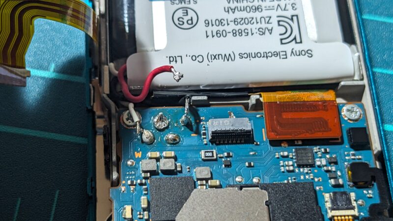 以前修理したNW-ZX1も例外なくバッテリー線がハンダ付けされていて作業に手こずった記憶が……。