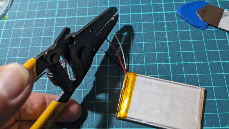 ケーブルが長すぎる場合は、外したバッテリーの長さに合わせてカットして、先端の被覆部分はワイヤーストリッパーで剥いて芯線を出す。