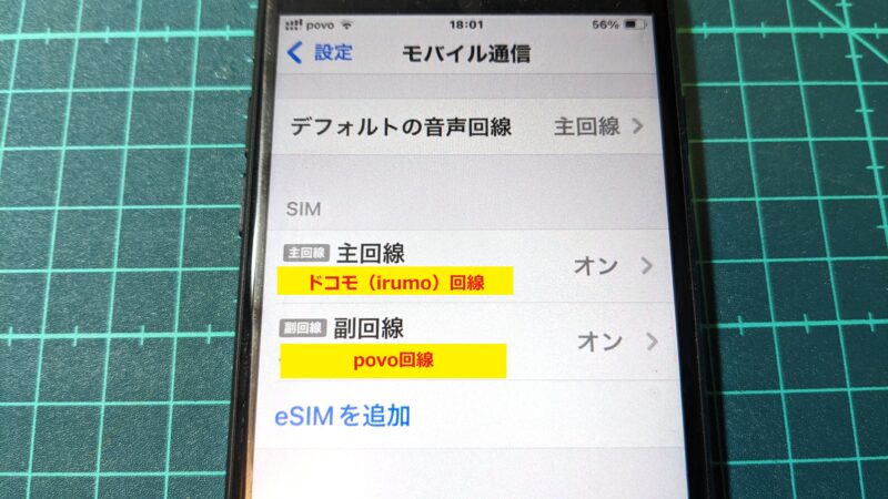 現在、このiPhoneには物理simでイルモ、eSIMにpovoが設定されているが、デフォルトでは名称が「主回線」と「個人」に割り振られている。