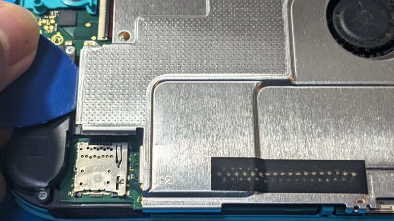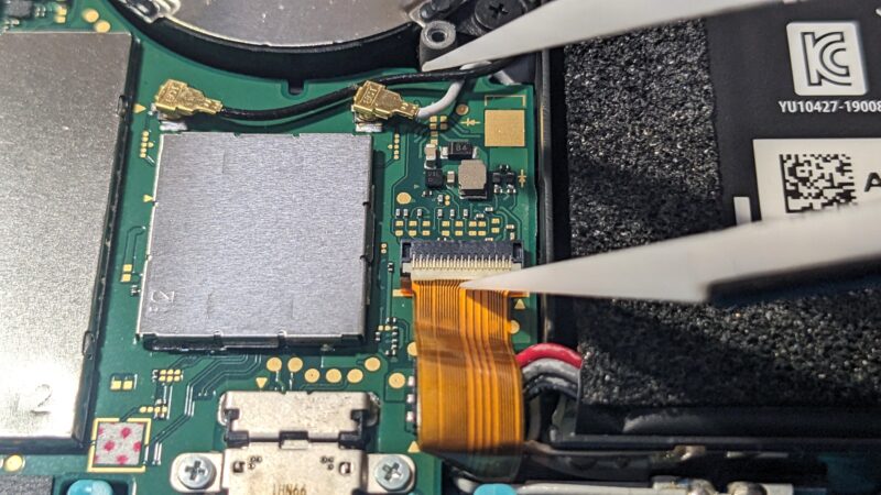 次にバッテリーのケーブルを外す作業だが、このコネクタはケーブルの下からピンセットの先で根元付近を垂直に持ち上げると外れる構造になっている。