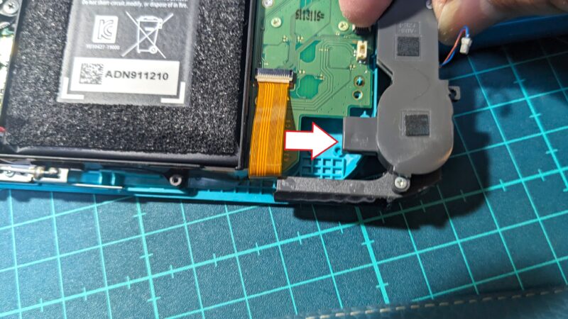 ネジが外れたら、左コントローラの基板がフリーになるので持ち上げて取り外す。