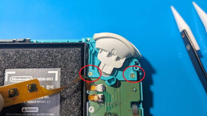 直近で取り外した左コントローラの基板を取り付ける際はフレキケーブルが基板下に潜らないように、ピンセットでケーブルを穴に通しながら基板を取り付けよう。