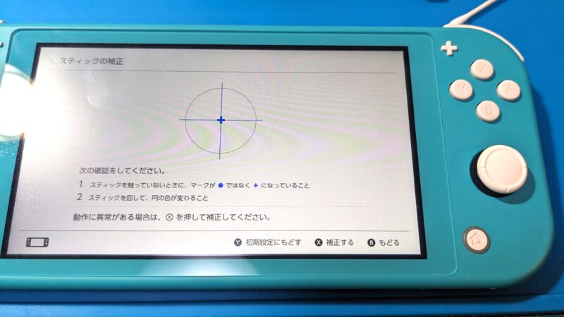 部品交換した都合でセンター位置がズレる事もあるので、この画面からYボタンの初期設定に戻すやXボタンを押して補正を試してみて、上手く動作するようになったら問題ない。