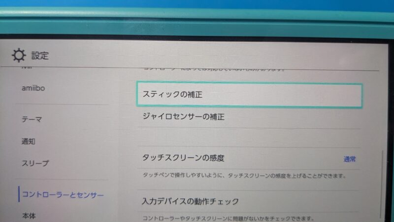 Lボタン付近にある写真赤マルのボタンを爪の先で長押しすると電源が入るので、そこから太陽マーク(歯車マーク)の設定画面に入り、「コントローラーとセンサー」→「スティックの補正」に入る。