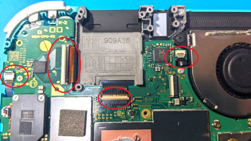 写真赤マルのフレキケーブル根元のラッチを立てて引き抜く(4本)。